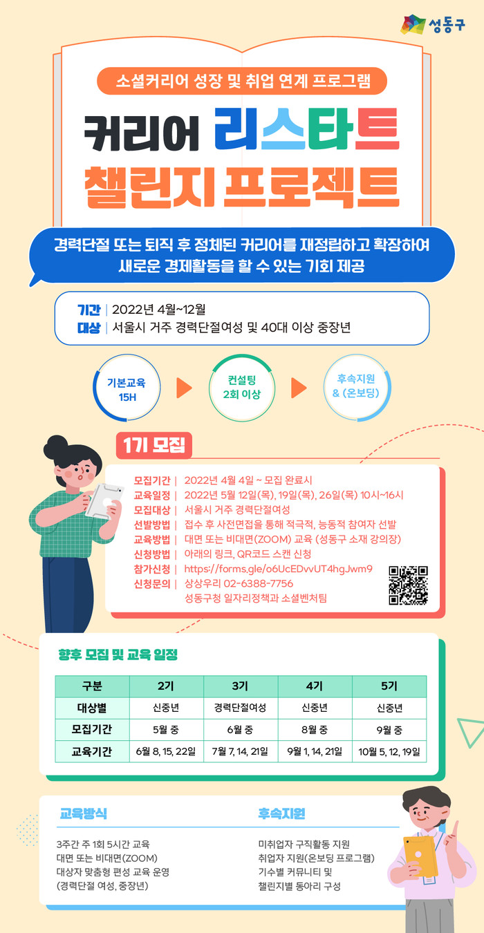 [시민일보 = 홍덕표 기자] 서울 성동구(구청장 정원오)는 경력보유여성 및 40대 이상 중장년을 대상으로 소셜벤처 재취업·이직을 위한 취업 역량 강화 프로그램을 마련하고 참여자를 모집한다고 밝혔다.