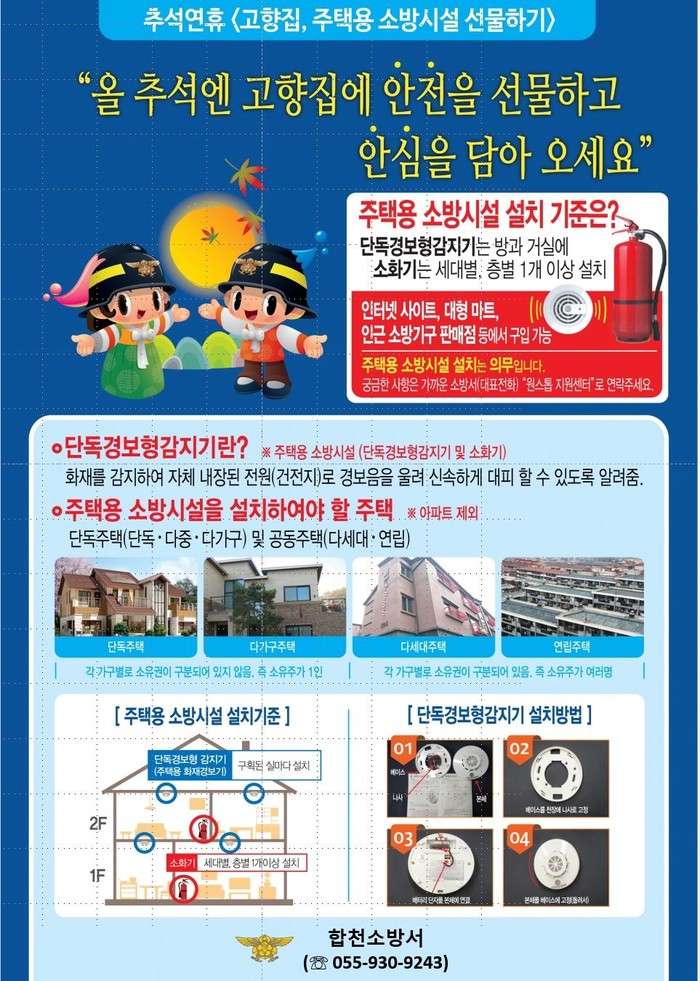 이병근 합천소방서장은 “이번 추석 고향집에 주택용 소방시설로 안전을 선물하시길 바라며, 부주의로 인한 화재피해가 없도록 주의하여 안전하고 풍성한 명절이 되길 바란다”라고 밝혔다.