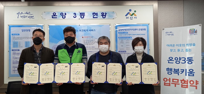 충남 아산시 온양3동 행복키움추진단은 17일 지역 복지 향상을 위해 (주)컴플러스와 행복키움 저소득가정 후원 업무협약을 체결했다. 이날 협약에 따라 컴플러스는 온양3동 취약계층을 지원하기 위해 매달 5만원을 후원한다. 사진은 협약식에서 관계자들이 기념촬영을 하는 모습. (사진제공=아산시청)