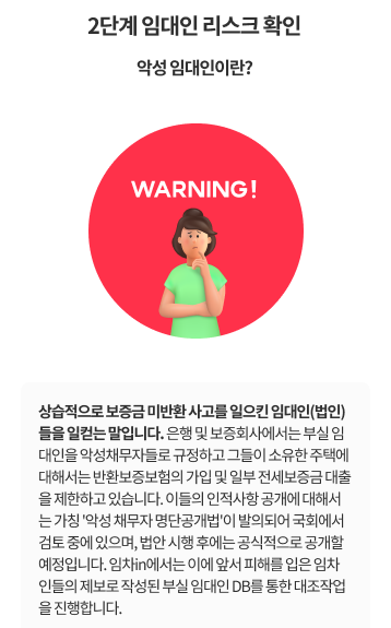 당초 국토교통부는 출시 예정인 안심전세앱에 부실임대인 명단을 넣을 계획이었으나 명단 공개를 위한 근거법을 마련하지 못해 해당 기능이 빠진 상태다. 반면 아이엔이 출시한 '임차in'의 경우 공익적 목적을 위해 악성임대인 리스트 등재 여부를 공개하는 것이기에 명예훼손에 대한 처벌이 없다는 법적 자문을 거쳐 해당 서비스를 제공한다.