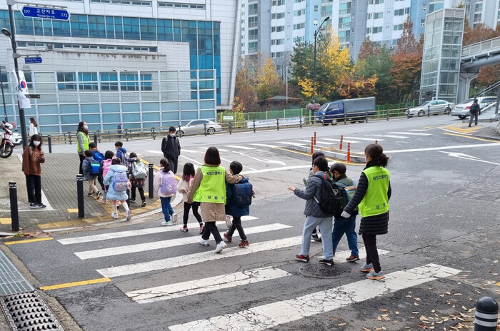 | ▲ 성동구 워킹스쿨버스 교통안전지도사가 아이들의 등하교를 안전하게 지도하고 있다. (사진=성동구청 제공) |