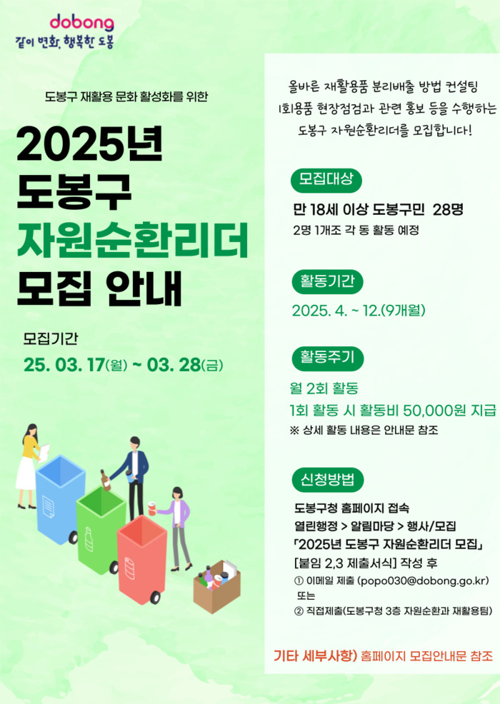 [시민일보 = 문민호 기자] 도봉구(구청장 오언석)는 자원순화문화를 선도하는 ‘자원순환리더’를 오는 28일까지 모집한다.