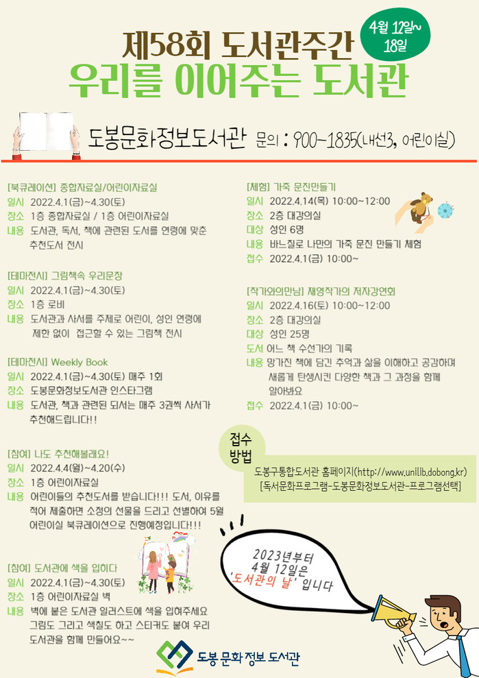 [시민일보 = 박준우 기자]서울 도봉구(구청장 이동진) 도봉문화정보도서관은 제58회 도서관주간을 맞아 오는 12~18일 기념행사를 진행한다고 7일 밝혔다.