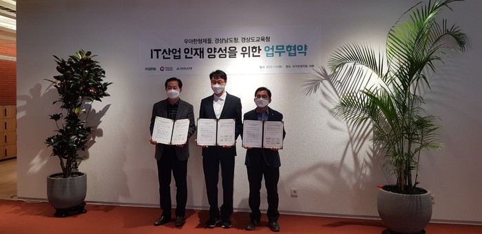 경상남도교육청(교육감 박종훈), 경상남도(도지사 권한대행 하병필), ㈜우아한형제들(대표 김범준)은 25일 경남지역 특성화고등학교 IT 분야 인재 양성을 위한 상호 업무협약을 체결했다. 협약식은 경남교육청 최병헌 학교정책국장과 경남도 오종수 통합교육추진단장, ㈜우아한형제들 송재하 CTO(최고기술책임자)를 비롯한 세 기관 관계자들이 참석한 가운데 ㈜우아한형제들 본사에서 진행됐다.