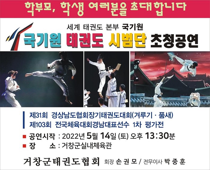 거창군은 오는 5월 14~15일과 5월 21일 총 3일간 거창군체육관에서 ‘제31회 경남협회장기 겸 제103회 전국체전 경남 대표선수 선발 1차 평가전 대권도 대회’를 개최한다.