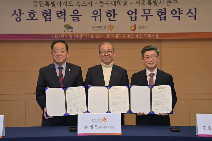 | ▲ (왼쪽부터)이병선 속초시장, 윤재웅 동국대학교 총장, 김길성 중구청장이 상호협력을 위한 업무협약을 맺고 있다 (사진=중구청 제공) |
