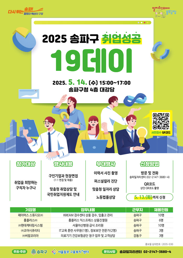 신청은 13일까지 송파일자리센터에 방문하거나 전화, 또는 홍보물에 있는 QR코드로 사전 신청할 수 있다. 당일 현장 접수도 가능하다.