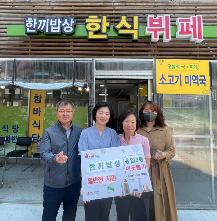 [시민일보 = 이대우 기자] 서울 은평구(구청장 김미경) 응암3동은 최근 저소득 홀몸노인들에게 밑반찬을 지원하는 ‘한끼밥상’을 방문해 감사의 마음을 전했다고 밝혔다.