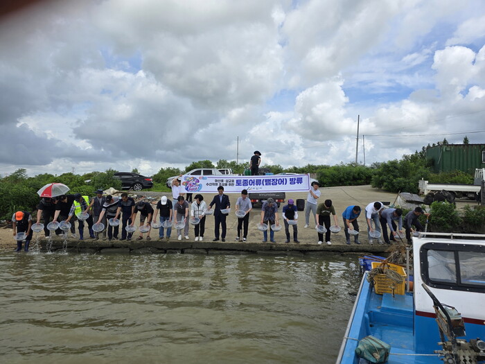 충남 아산시가 어족자원 증대와 내수면 생태계 복원을 위해 최근 이틀에 걸쳐 대형 공공용 수면인 아산호·삽교호에 뱀장어 치어 약 4만9160 마리를 방류했다. 이번 행사는 선장면 궁평리 나루터 선착장 및 영인면 창용리 쌀조개섬 선착장에서 열렸다. 사진은 참여자들이 뱀장어 치어를 방류하고 있는 모습. (사진=아산시청 제공)
