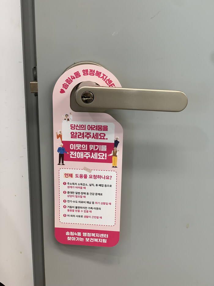 [인천=문찬식 기자] 인천 동구 송림4동(동장 김준수)은 홍보용‘문고리 전단지’를 제작·배부하며 복지 사각지대 해소에 나섰다고 밝혔다.