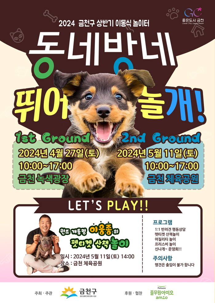 반려견 놀이터는 오는 27일 금천녹색광장에서, 5월11일에는 금천체육공원에서 2회에 걸쳐 열린다.