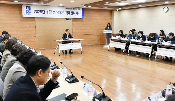 경기 수원시 영통구는 지난 23일 구청 2층 상황실에서 ‘2025년 1월 중 확대간부회의’를 개최했다. 이번 회의는 구정 운영의 핵심 현안을 면밀히 점검하고 2025년도 주요 업무 추진 계획을 체계적으로 추진하기 위해 마련됐다. 사진은 박사승 구청장(가운데) 및 참석자들이 의견을 나누고 있는 모습. (사진=영통구청 제공)