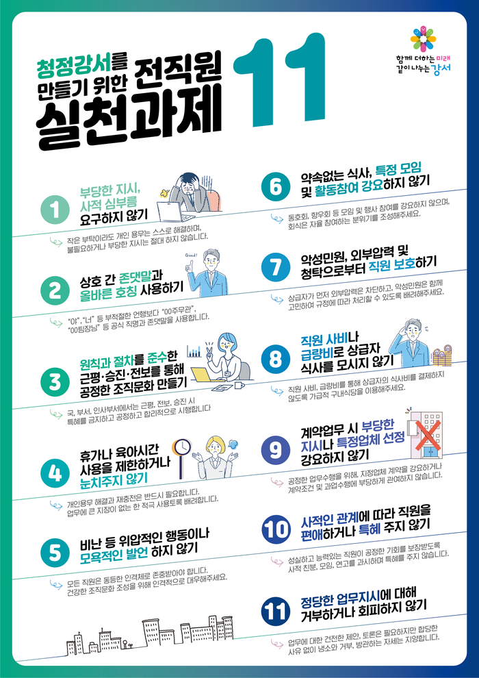 [시민일보 = 이대우 기자] 강서구(구청장 진교훈)가 모욕적 발언, 정당한 휴가 사용 제한, 부정청탁 등의 관행 근절하는, ‘청정강서를 만들기 위한 전직원 실천과제 11’을 선정하고, 전직원 실천운동을 추진한다.