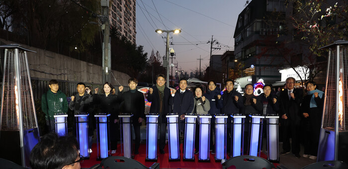 노원구가 최근 오승록 구청장을 비롯해 시ㆍ구의원, 경춘선 공릉숲길 상인, 주민 등 약 100여명이 참석한 가운데 경춘선 공릉숲길 빛의 거리 점등식을 개최했다. 사진은 점등식에 참석한 오 구청장(왼쪽 다섯 번째)이 관계자들과 기념 촬영을 하는 모습. (사진=노원구청 제공)