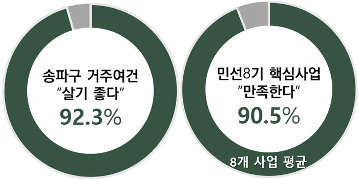 특히, 민선 8기 '구민을 주인으로 섬기는 명품도시 송파'를 비전으로 추진 중인 ▲8대 핵심사업의 종합만족도는 90.5%로 구민 대다수가 구정 운영을 적극 지지하는 것으로 조사됐다.