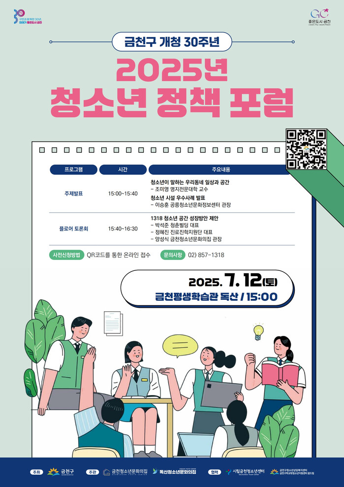 [시민일보 = 여영준 기자] 금천구(구청장 유성훈)는 12일 오후 3시 금천평생학습관 독산에서 ‘2025 금천구 청소년 정책 포럼’을 개최한다고 밝혔다.
