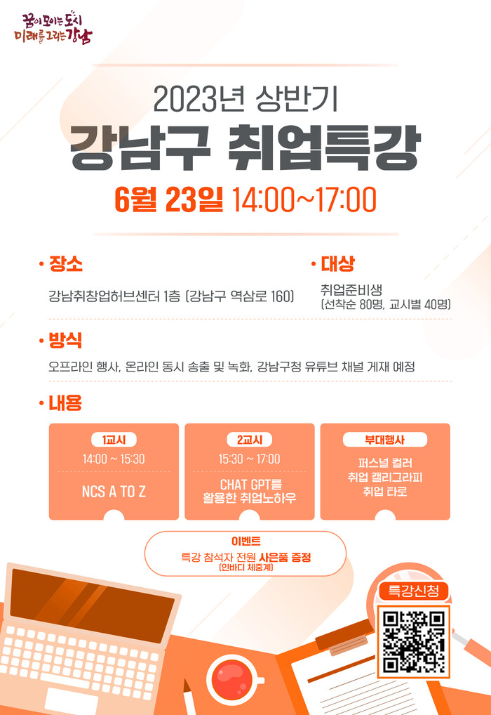 [시민일보 = 이대우 기자] 서울 강남구(구청장 조성명)가 취업준비생의 구직활동을 위해 오는 23일 특강과 현장면접을 진행한다.