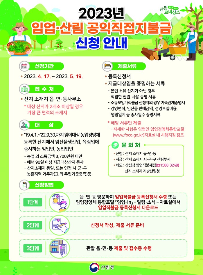 합천군(군수 김윤철)은 4월 17일부터 5월 19일까지 2023년 임업ㆍ산림 공익직접지불금(이하 ‘임업직불금’)을 신청받는다고 11일 밝혔다.