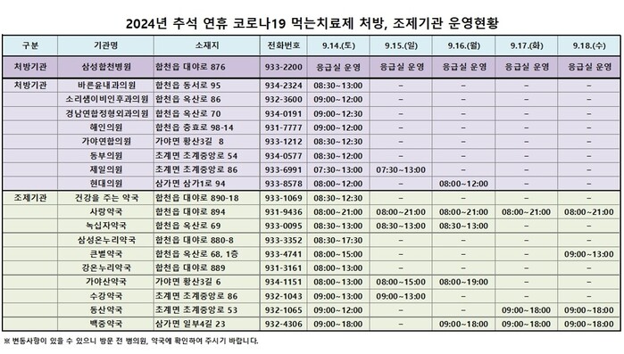 또한 추석연휴 기간 내 코로나19의 원활한 진단과 치료를 위해 권역별 처방기관 및 조제기관을 운영한다. 먹는치료제 수급의 원활한 조정으로 연휴기간 운영하는 조제기관에 충분히 공급될 수 있도록 하여 군민의 불편을 최소화하겠다고 밝혔다.