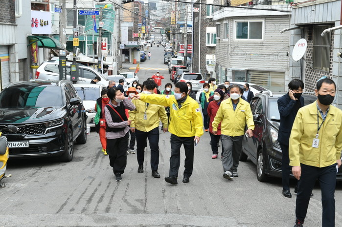 안승남 경기 구리시장이 30일 구리시 원수택로 32번길 59-26(수택2동) 일대에 조성된 ‘범죄예방 환경디자인’ 사업 완료 현장을 찾아 현장점검을 진행하며 시민들의 의견을 직접 청취했다. 사진은 이날 안 시장(가운데)이 시민들과 함께 현장을 둘러보고 있는 모습. (사진제공=구리시청)