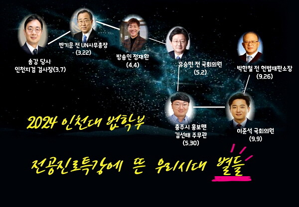 인천대학교 법학부에서‘가슴 설레는 일이 생길 것 같은 법대’ 구현을 위해 야심차게 준비했던‘2024학년도 인천대 법학부 전공 진로특강 시리즈’가 대단원의 막을 내렸다. 그리고 본 명품특강 시리즈에 특강 강사로 참여했던 우리 시대의 별들은‘북두칠성’으로 이어져, 인천대 법학부 학생들에게 소중한 나침반과 길라잡이의 역할을 해줄 것으로 기대되고 있다.