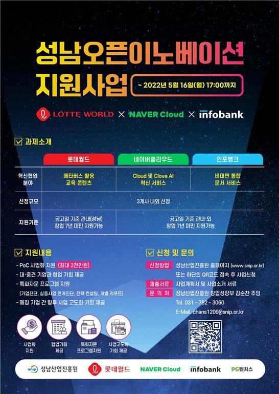 [성남=오왕석 기자] 성남산업진흥원에서는 롯데월드, 네이버 클라우드, 인포뱅크와 함께 창업기업 간 사업협력을 통해 신기술 창출 및 개방형 혁신을 도출하기 위한「2022 성남 오픈이노베이션」 지원사업의 참여기업을 내달 16일까지 모집한다.