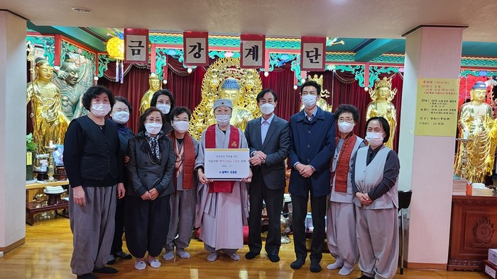 서울 종로구 청운효자동은 지역내 위치한 범혜사 홍법원으로부터 후원받은 백미를 최근 지역내 취약계층 주민 100가구에 전달했다. 앞서 홍법원 신도들이 십시일반으로 모은 성금으로 쌀(10kg)·100포를 구입해 동주민센터로 전달한 데 따른 것이다. 사진은 전달식에서 관계자들이 기념촬영을 하는 모습. (사진제공=종로구청)