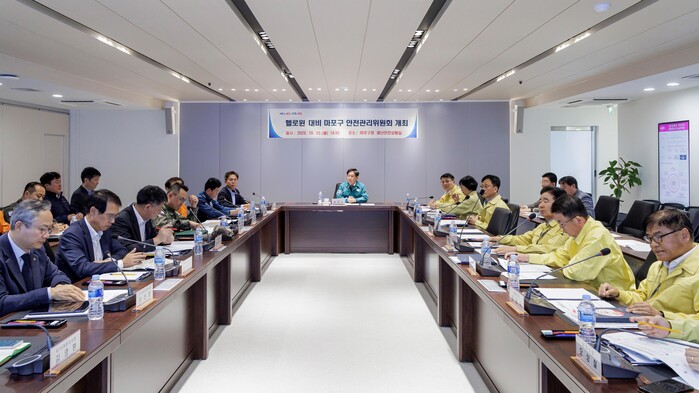 | ▲ 23일 구청 재난안전상황실에서 열린 핼러윈 대비 마포구 안전관리위원회에서 박강수 구청장이 마포경찰서, 마포소방서 등 안전마포 핫라인 9개 기관 관계자들과 핼러윈 기간 안전 대책에 대해 논의하고 있다. (사진=마포구청 제공) |