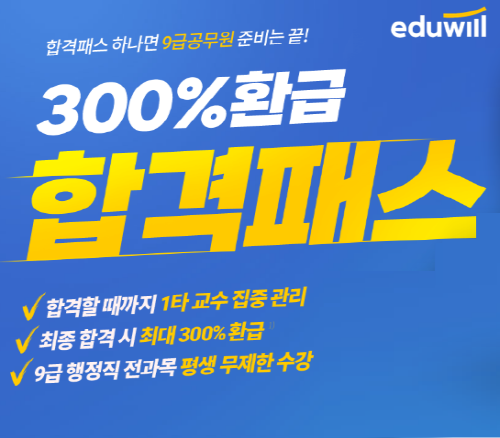 [시민일보 = 여영준 기자] 종합교육기업 에듀윌은 2023년 9급공무원 전 직렬을 한 번에 대비할 수 있는 ‘300%환급 합격패스’ 과정을 운영한다고 6일 밝혔다.