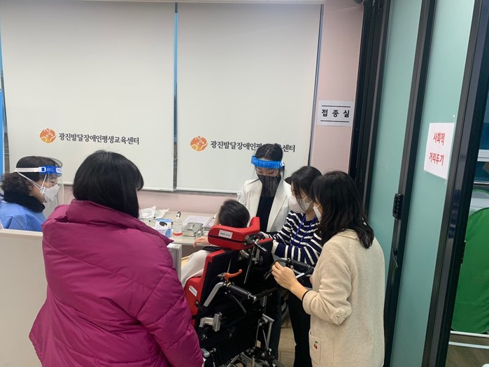 서울 광진구가 25일 발달장애인을 대상으로 ‘찾아가는 백신접종센터’를 운영했다. 이날 오전 자양동 소재 광진발달장애인평생교육센터에서는 2차 접종을 완료하고 3개월(90일)이 경과한 총 9명의 발달장애인이 화이자 3차 접종을 완료했다. 사진은 이날 발달장애인이 백신을 접종받고 있는 모습. (사진제공=광진구청)