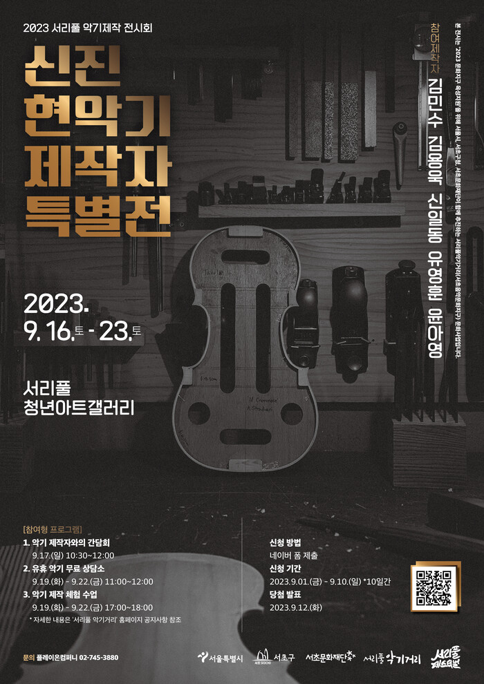 [시민일보 = 이대우 기자] 서울 서초구(구청장 전성수)와 서초문화재단은 오는 16~23일 ‘2023 서리풀 악기제작 전시회’를 서리풀청년아트갤러리(서초구 남부순환로 323길 1)에서 연다.
