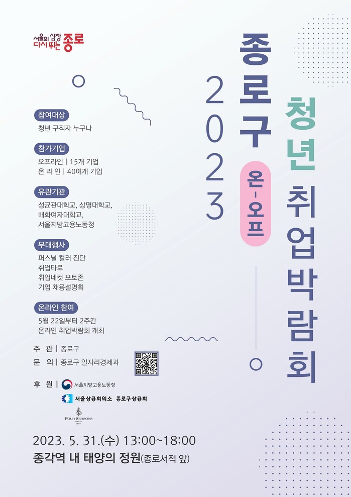 [시민일보 = 이대우 기자] 종로구(구청장 정문헌)가 오는 31일 오후 1~6시 종각역 태양의 정원(종로서적 앞)에서 ‘청년 취업박람회’를 개최한다.