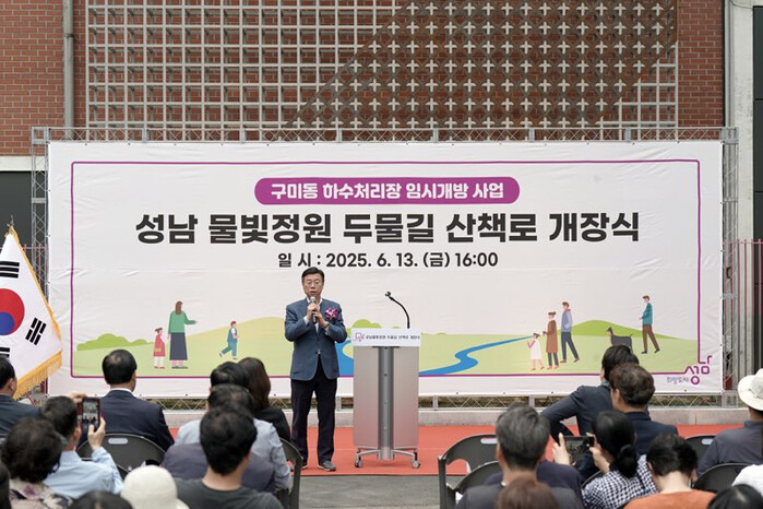 [성남=오왕석 기자] 신상진 성남시장은 13일 구미동 옛 하수처리장 부지에 새롭게 조성된 ‘성남물빛정원 두물길 산책로 개장식’에 참석했다.