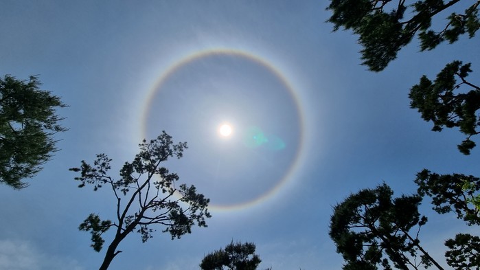 햇무리는 햇빛이 대기 중 수증기에 굴절돼 태양 주변으로 둥근 원 모양 무지개처럼 나타나는 현상이다.