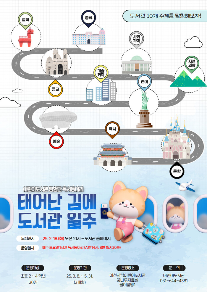[시민일보 = 민장홍 기자] 경기 이천시 어린이도서관이 오는 3월8일부터 초등학생 어린이 대상 독서 챌린지 ‘태어난 김에 도서관 일주’를 운영한다고 밝혔다.
