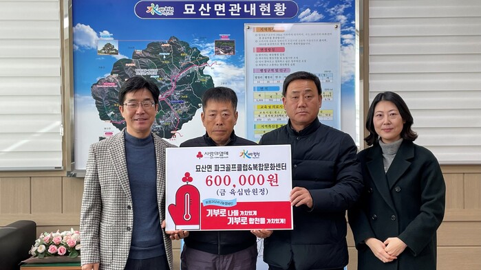 한호상 묘산면장은 “이웃을 생각하는 따뜻한 마음을 베풀어주신 묘산면 파크골프클럽과 복합문화센터에 진심으로 감사드리며, 기탁하신 성금은 도움의 손길이 필요한 이웃에게 잘 전달하겠다”고 밝혔다.