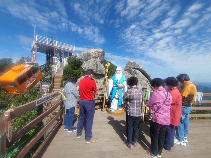 | 대봉산 산신령과 소원바위 소원성취기원 관광객들 |