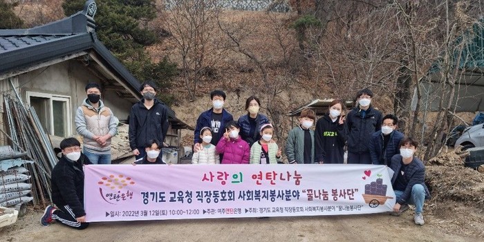 경기도교육청 직장 동호회 ‘꿀나눔 봉사단’이 최근 여주지역 소외계층 가정에 1875장의 연탄 나눔을 진행했다. 사진은 이날 참여한 봉사회 회원 및 도교육청 소속 직원과 자녀들이 기념촬영을 하는 모습. (사진제공=경기도교육청)