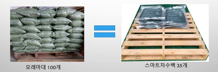 스마트 차수백은 주원료인 고흡수성 수지 SAP는 기저기, 생리대등에 사용하는 친환경 무독성 소재이며 실용신안 출원중인 안정적인 구조로 타사제품대비 차수 기능이 우수하다. 사용전 250g 으로 가볍지만 침수상황에서 단시간(3~5분)내에 약 20L 이상의 물을 흡수하여 10cm 이상 높이의 차수벽을 형성한다. 모래마대 1파레트(100개, 700kg)와 스마트 차수백 35장(8.7kg)으로 동일한 차수효과를 내어 침수상황 대처에 효율과 경제성을 제공한다.