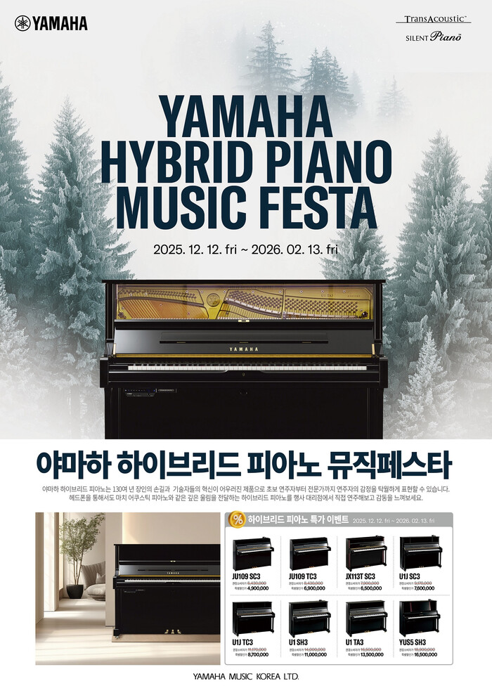 [시민일보 = 김민혜 기자] 야마하뮤직코리아는 12일부터 2026년 2월 13일까지 ‘하이브리드 피아노 뮤직 페스타’를 전국 야마하 직영점과 41개 공식 대리점에서 진행한다고 밝혔다.