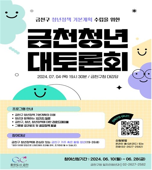 [시민일보 = 여영준 기자] 금천구(구청장 유성훈)는 4일 오후 7시30분 구청 대강당에서 ‘금천구 청년정책 5개년 기본계획’ 수립을 위해 지역 청년 100여명이 참여하는 ‘금천 청년 대토론회’를 개최한다고 밝혔다.