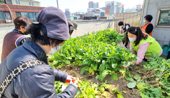 서울 도봉구 방학1동 지역사회보장협의체와 자원봉사캠프는 지난 17일 가정의 달을 맞아 어르신 감사 손편지, 두유, 열무 등으로 구성된 ‘행복꾸러미’를 제작해 지역내 홀몸노인 등 40명에 전달했다. 사진은 행복꾸러미에 들어갈 열무를 자원봉사캠프 관계자들이 수확하고 있는 모습. (사진제공=도봉구청)