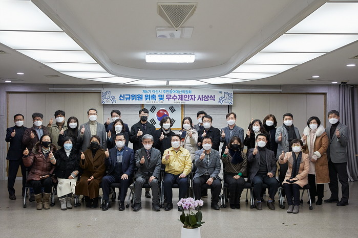 충남 아산시가 최근 제6기 주민참여예산위원회 신규위원 위촉 및 2021년 주민참여예산 공모사업 우수제안자 상장 수여식을 열고 지난해 12월 공개모집 등으로 최종 선발한 신규위원들에게 위촉장을 수여했다. 사진은 이날 오세현 시장(앞줄 오른쪽 다섯 번째)과 관계자들이 기념촬영을 하는 모습. (사진제공=아산시청)