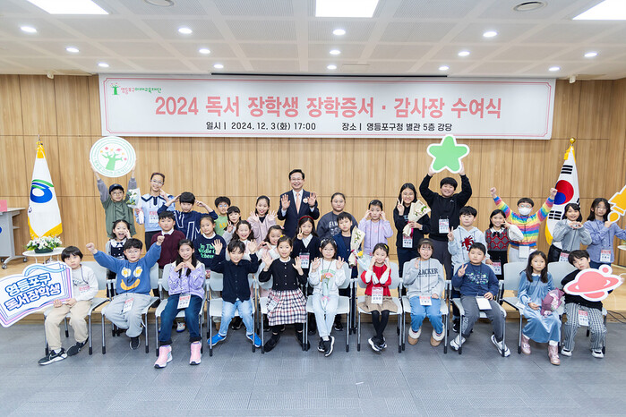 영등포구가 3일 구청 별관 5층 강당에서 2024 영등포구 독서 장학증서·감사장 수여식을 진행했다. 사진은 수여식에 참석한 최호권 구청장이 참석자들과 기념촬영을 하고 있는 모습. (사진=영등포구청 제공)