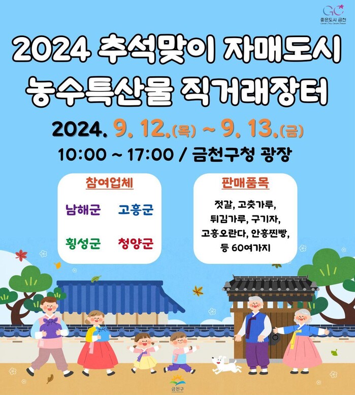 [시민일보 = 여영준 기자] 금천구(구청장 유성훈)는 추석을 맞아 12~13일 이틀간 구청 광장에서 ‘추석맞이 자매도시 농수특산물 직거래 장터’를 연다고 밝혔다.