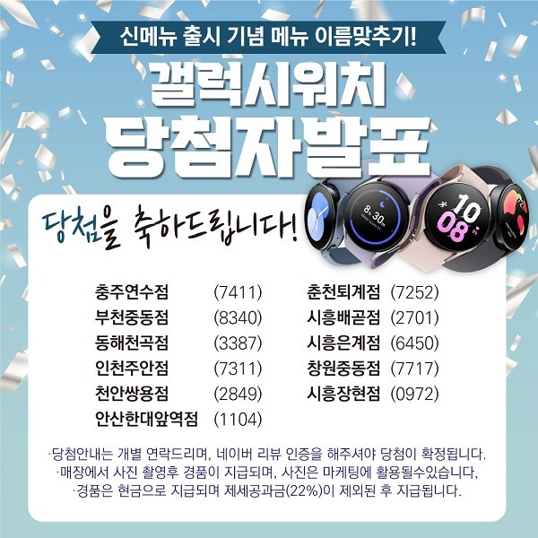 제공되는 경품으로는 갤럭시워치가 증정되며, 선정된 당첨자는 해당 매장을 방문해 점주와 기념사진 촬영한 후 경품을 받을 수 있다.