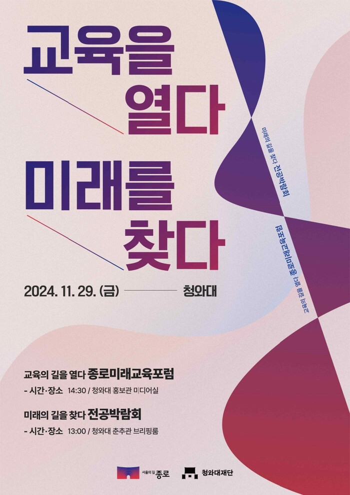 [시민일보 = 이대우 기자] 서울 종로구(구청장 정문헌)가 오는 29일 청와대 홍보관과 춘추관에서 ‘종로미래교육포럼 및 전공박람회’를 개최한다.