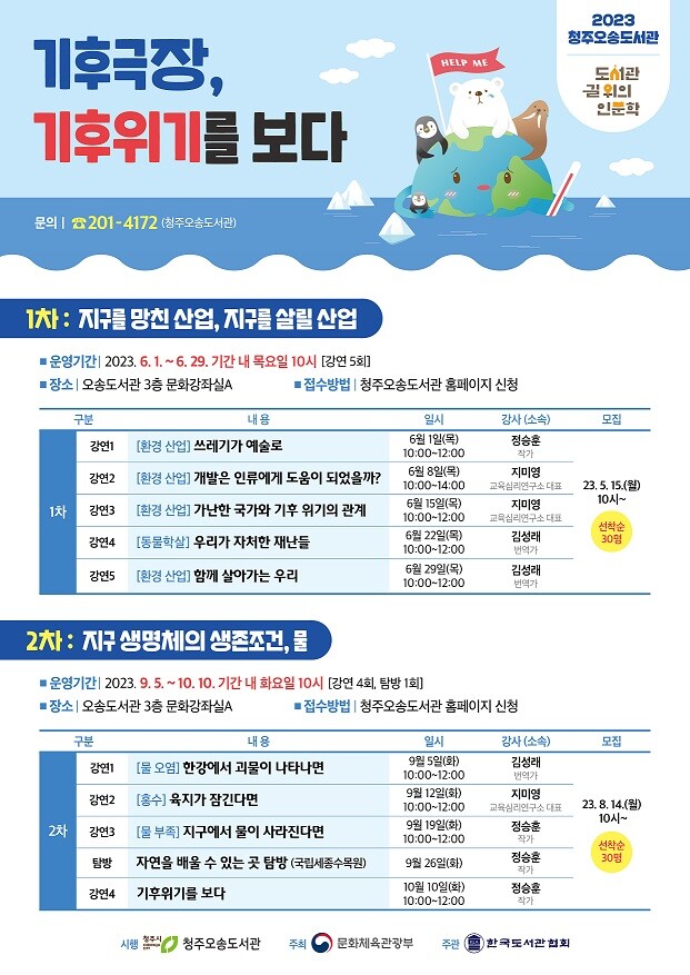 이 프로그램은 문화체육관광부 주최, 한국도서관협회가 주관하는‘2023년 도서관 길 위의 인문학’ 사업에 선정돼 추진하는 것이다. 오송도서관은 사회문제인 기후위기를 인문학적 관점으로 접근한‘기후극장, 기후위기를 보다’란 주제로 선정됐다.