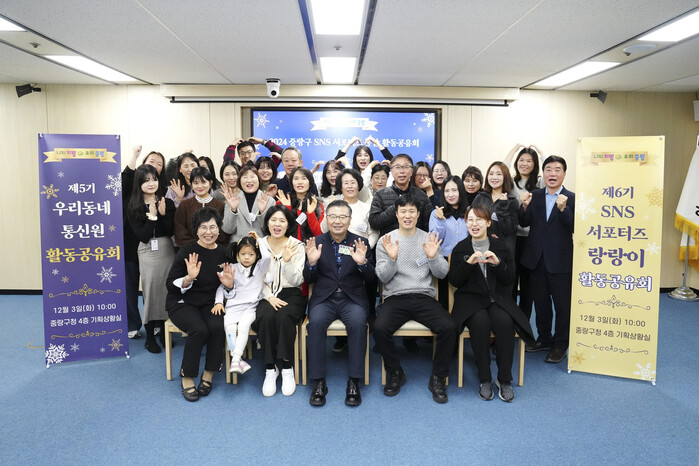 중랑구가 최근 구청 4층 기획상황실에서 ‘2024년 중랑구 SNS 서포터스 통합 활동공유회’를 개최했다. 행사에는 ‘제6기 SNS 서포터스 랑랑이’와 ‘제5기 우리동네 통신원’, 가족 등 30여명이 참석해 2024년 한 해 동안의 활동을 공유하고 우수 활동자를 표창하는 시간을 보냈다. 사진은 류경기 구청장과 관계자들이 기념촬영을 하는 모습. (사진=중랑구청 제공)