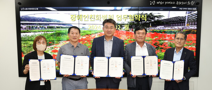 서울 노원구는 2일 구청·의료기관·장애인단체 간 장애인 친화병원 조성 및 운영을 위한 협약을 맺었다. 협약으로 장애인들이 의료기관을 이용할 때 겪는 불편을 최소화하고, 장애인 건강증진을 위한 다양한 사업을 공동으로 추진할 예정이다. 사진은 협약식에서 오승록 구청장(가운데)이 관계자들과 기념촬영을 하고 있는 모습. (사진=노원구청 제공)